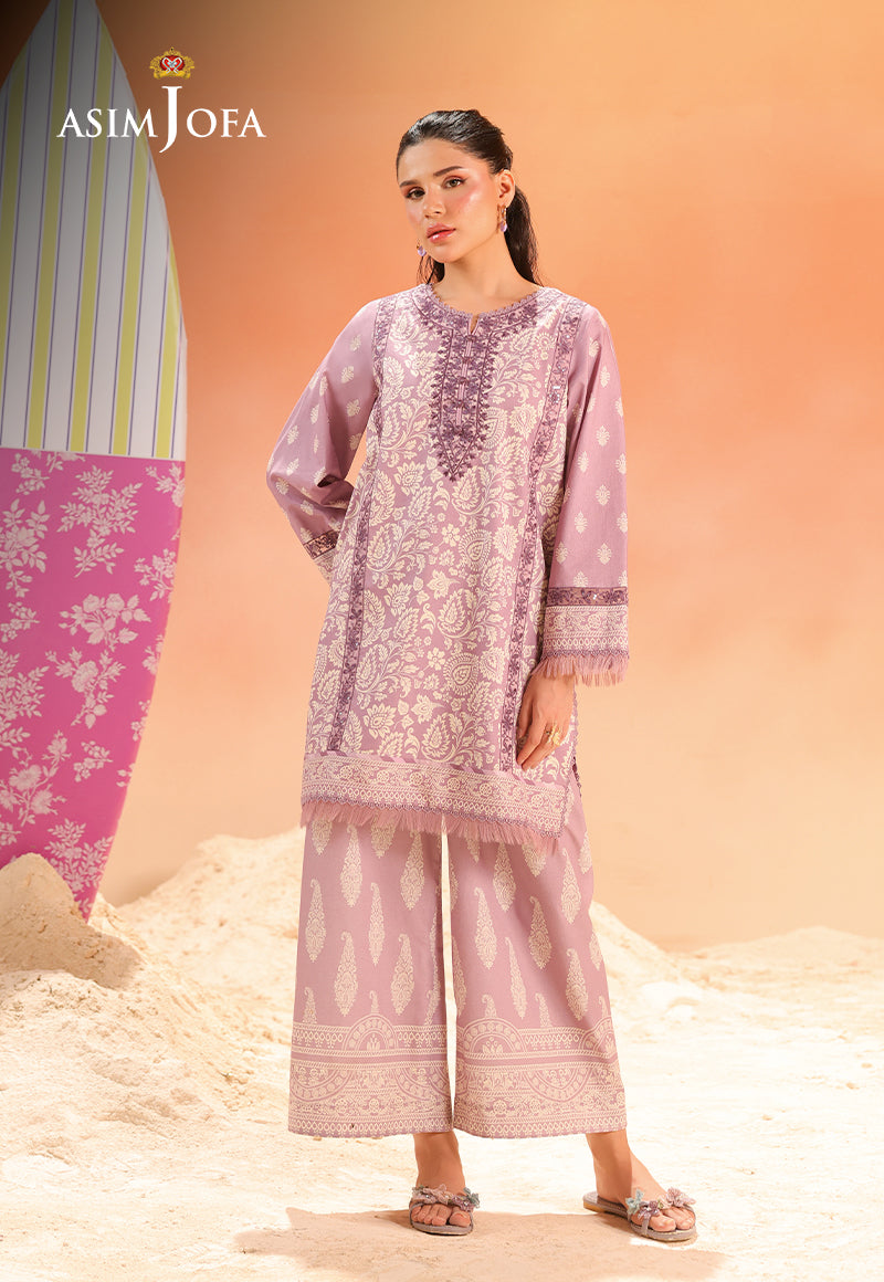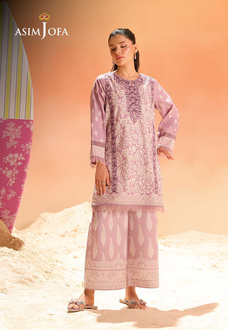 DESCRIPTION: Soft as twilight, this light purple ensemble dances with paisley patterns that flow like a poetic rhythm. The embroidered neckline, front, and sleeves shimmer with grace, while the printed trousers bring it all together like the final stanza of a well-written verse. DESIGN DETAILS: 1 pcs embroidered neckline on dyed organza 1 pcs embroidered front and sleeve lace on dyed organza 3 meter digital printed lawn shirt 2.5 meter digital printed cambric trouser