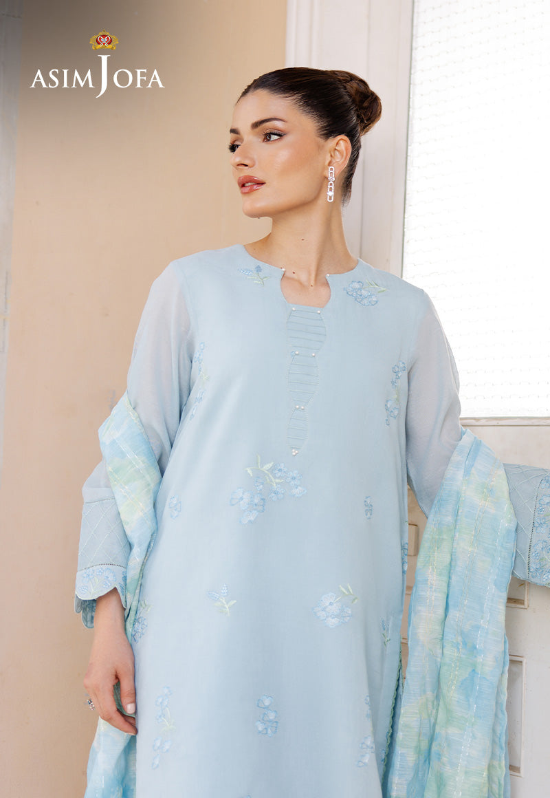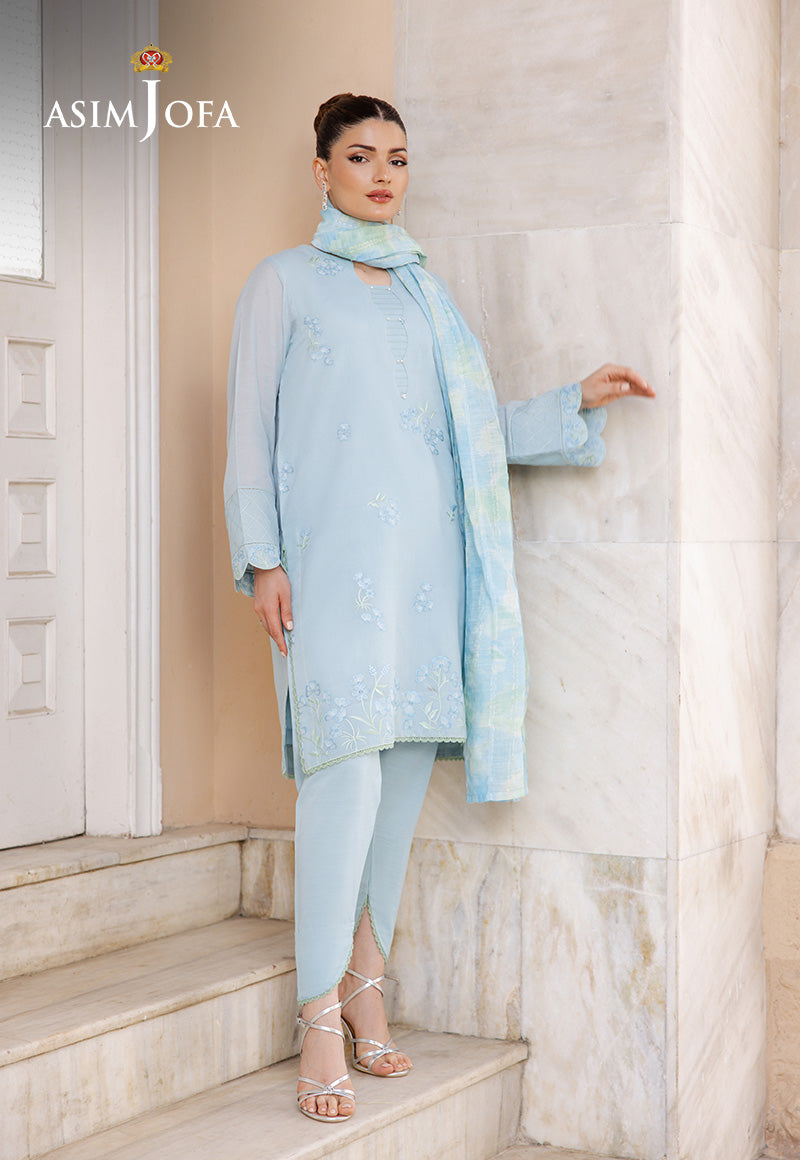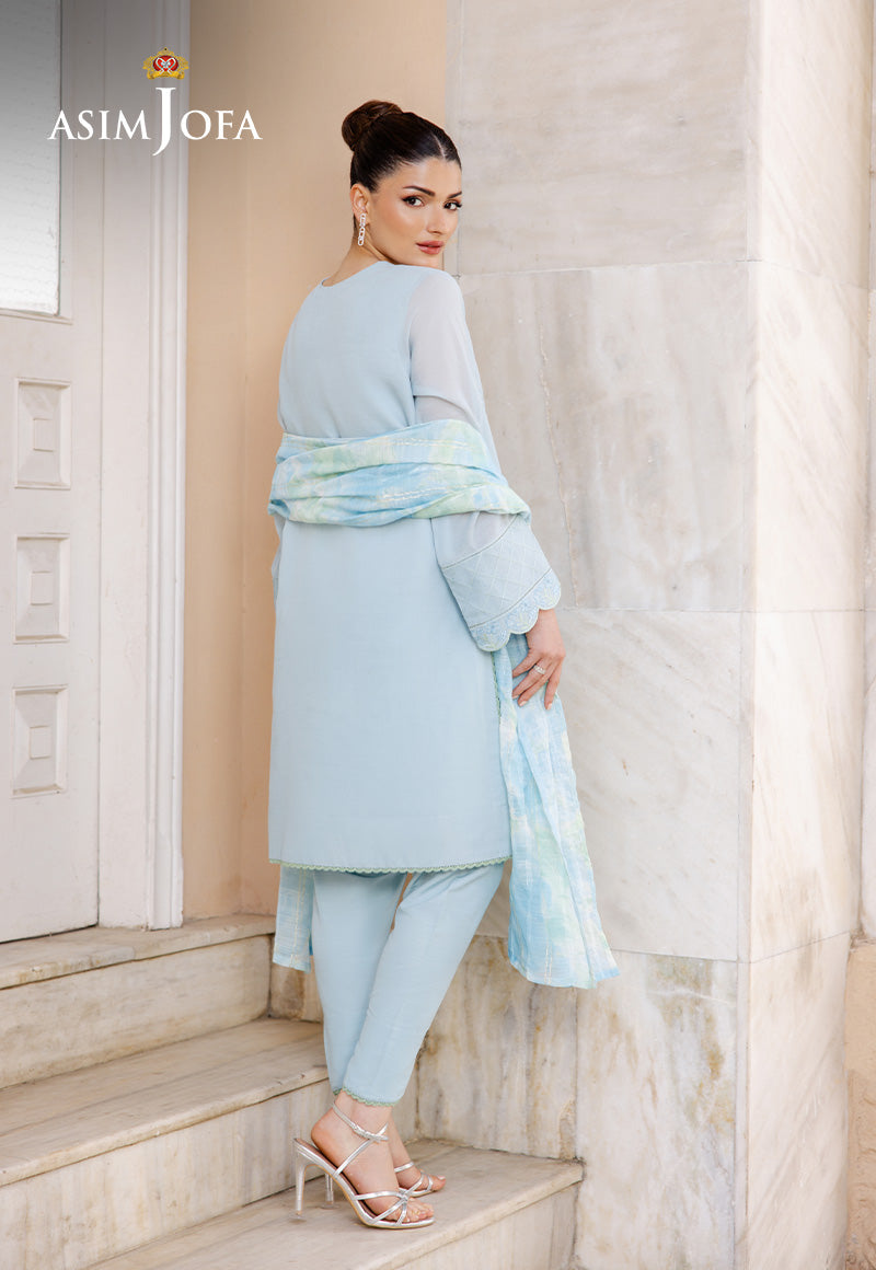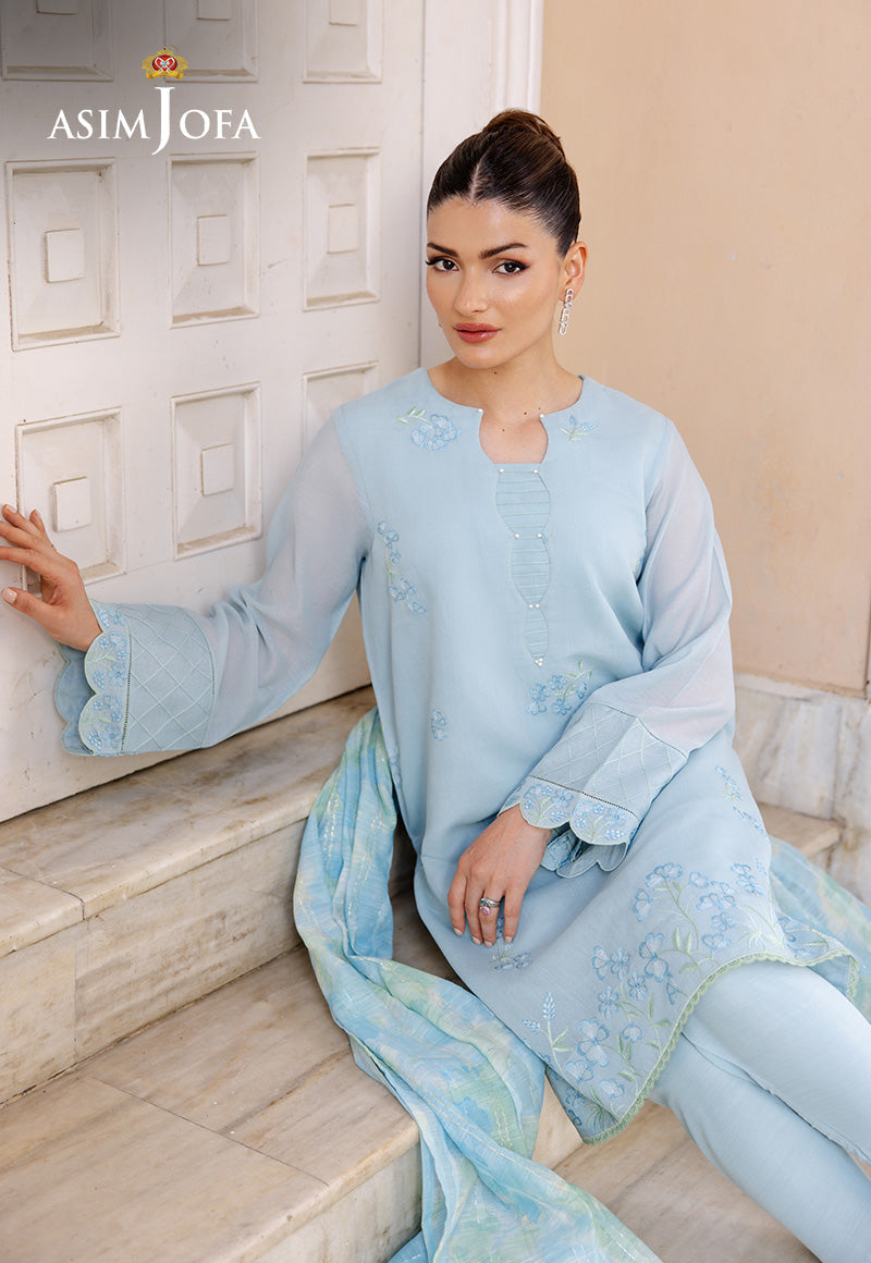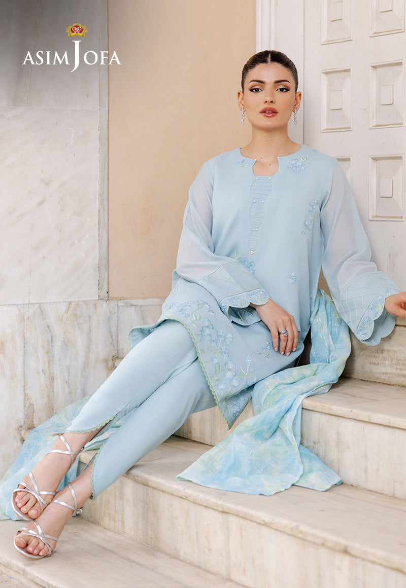 This sky blue ensemble radiates quiet sophistication with its shirt adorned in tonal embroidery that adds a rich textural dimension. Paired with chic tulip-style pants and a beautifully printed dupatta, it strikes the perfect balance between elegance and ease.