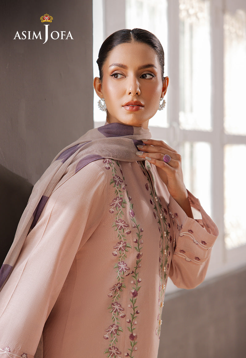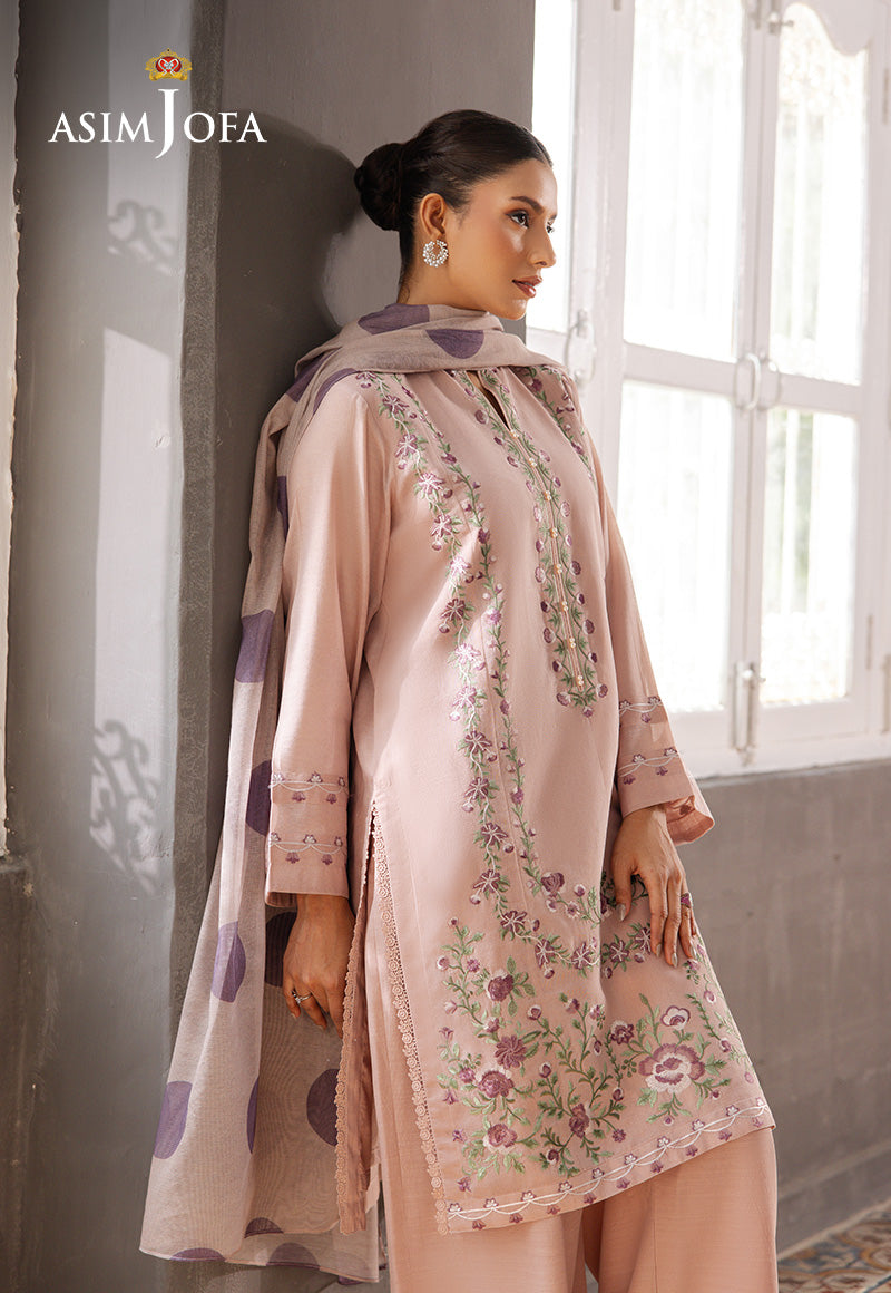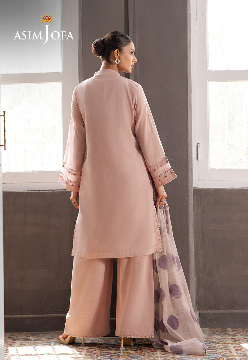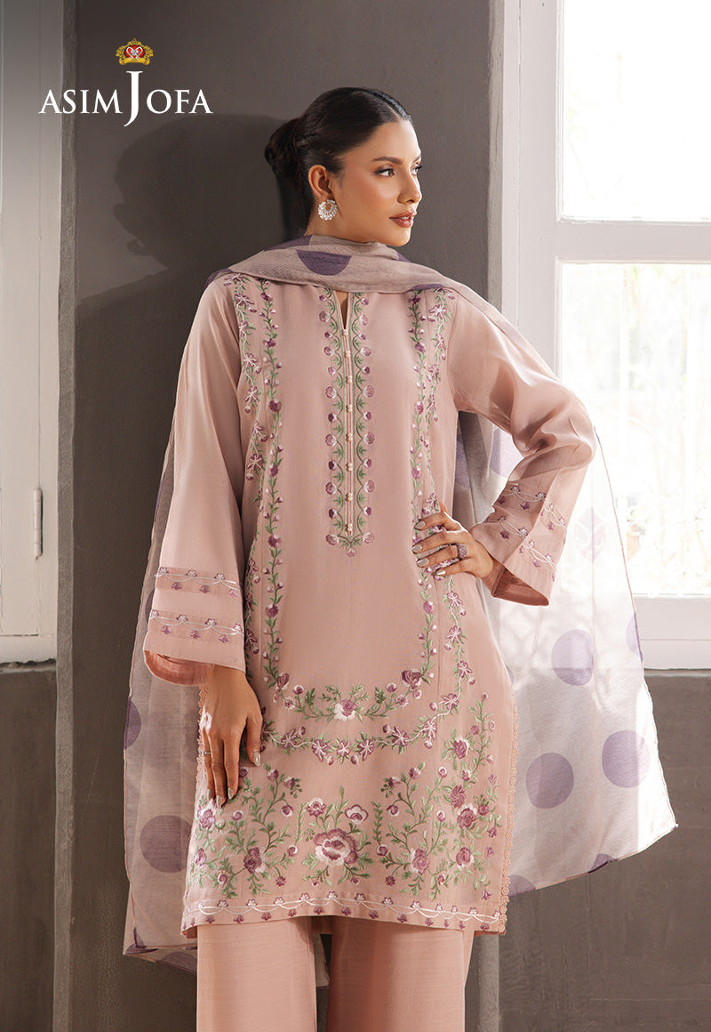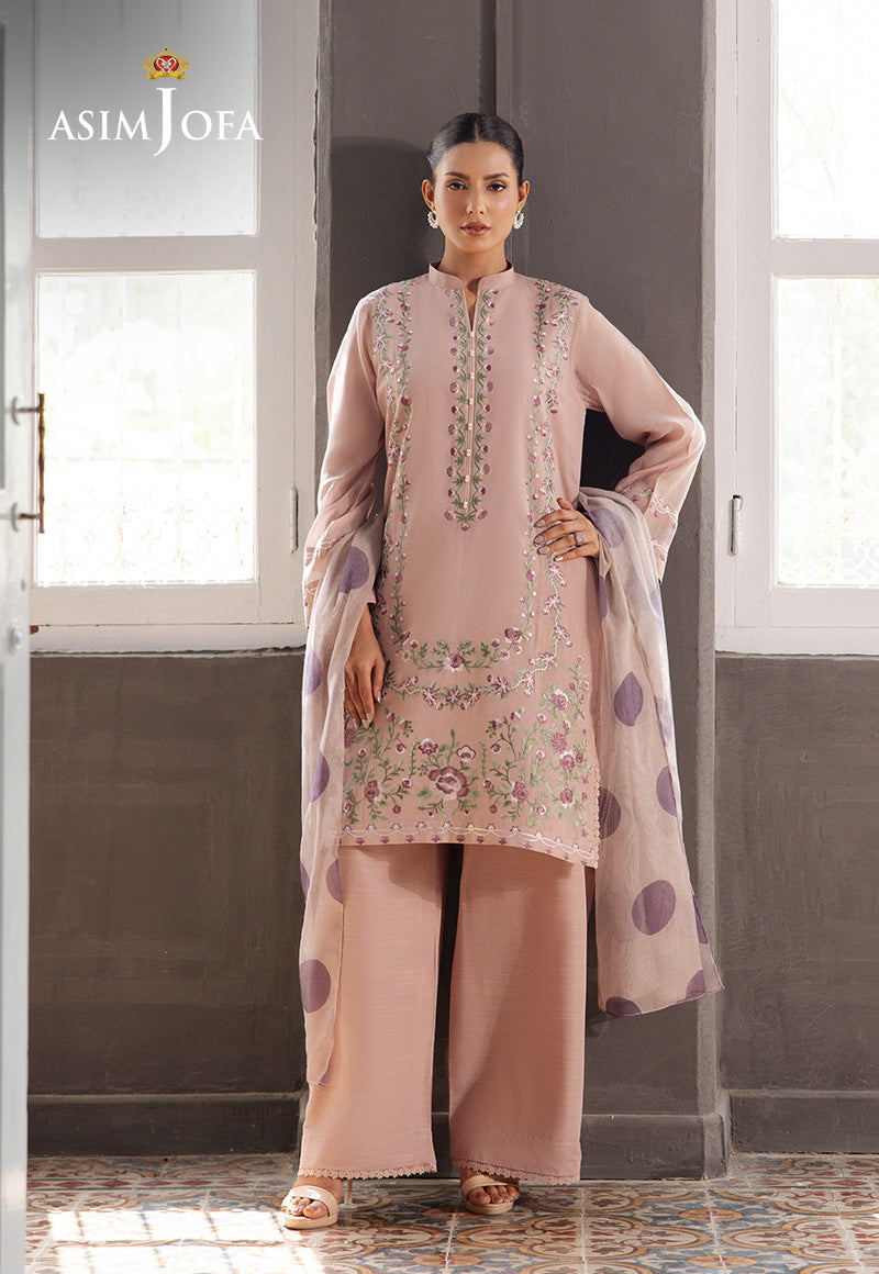 This light brown ensemble channels a gardenlike charm with its shirt adorned in exquisite multicolored floral embroidery. Paired with neatly tailored trousers and a lightweight dupatta featuring a playful polka dot print, it strikes a graceful balance between style and elegance.