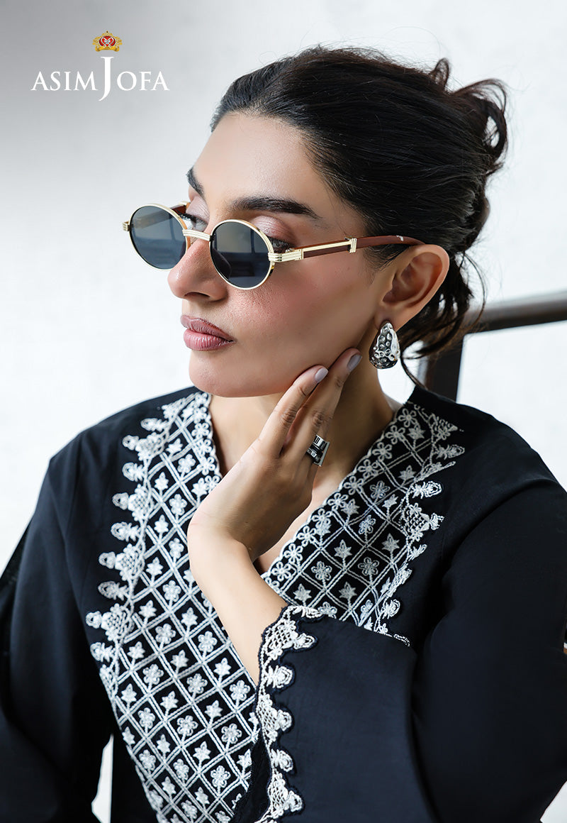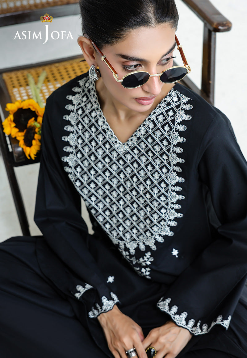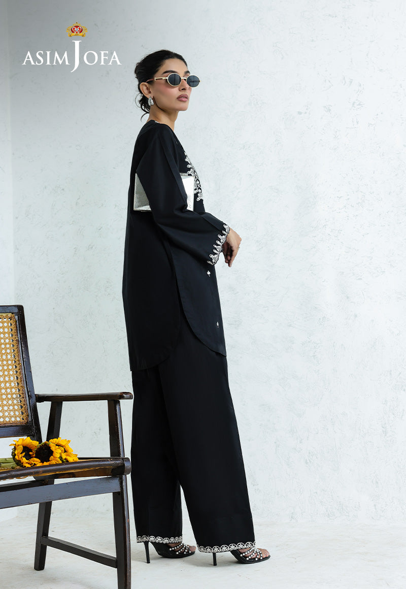 Taking monochromatic chic to the next level, this striking black outfit features a shirt adorned with ivory-hued embroidery, creating a visually captivating contrast. Paired with trousers showcasing minimal embroidery along the hem, it’s a bold yet refined statement in style.